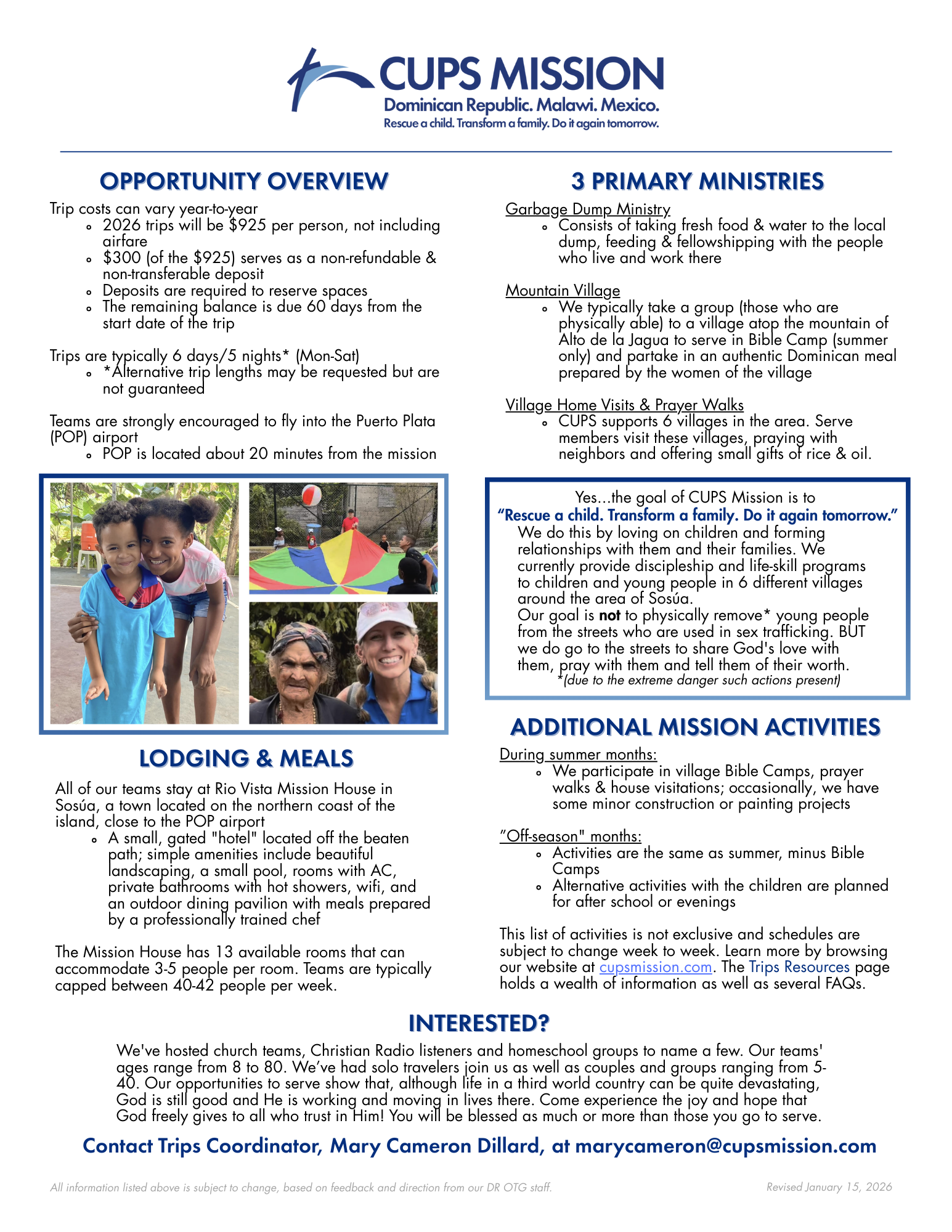 Catalyst has had the honor of serving with CUPS Mission in Sosua, Dominican Republic a couple of times in the past. Mike Williams (christian comedian) began CUPS ministry years ago with the heart to carry the gospel to the DR people after visiting the DR and feeling their heartbreak firsthand. This is the first mission trip we have taken in a few years and would love for you to join the mission team. We plan to take a team of approximately 15 members.
